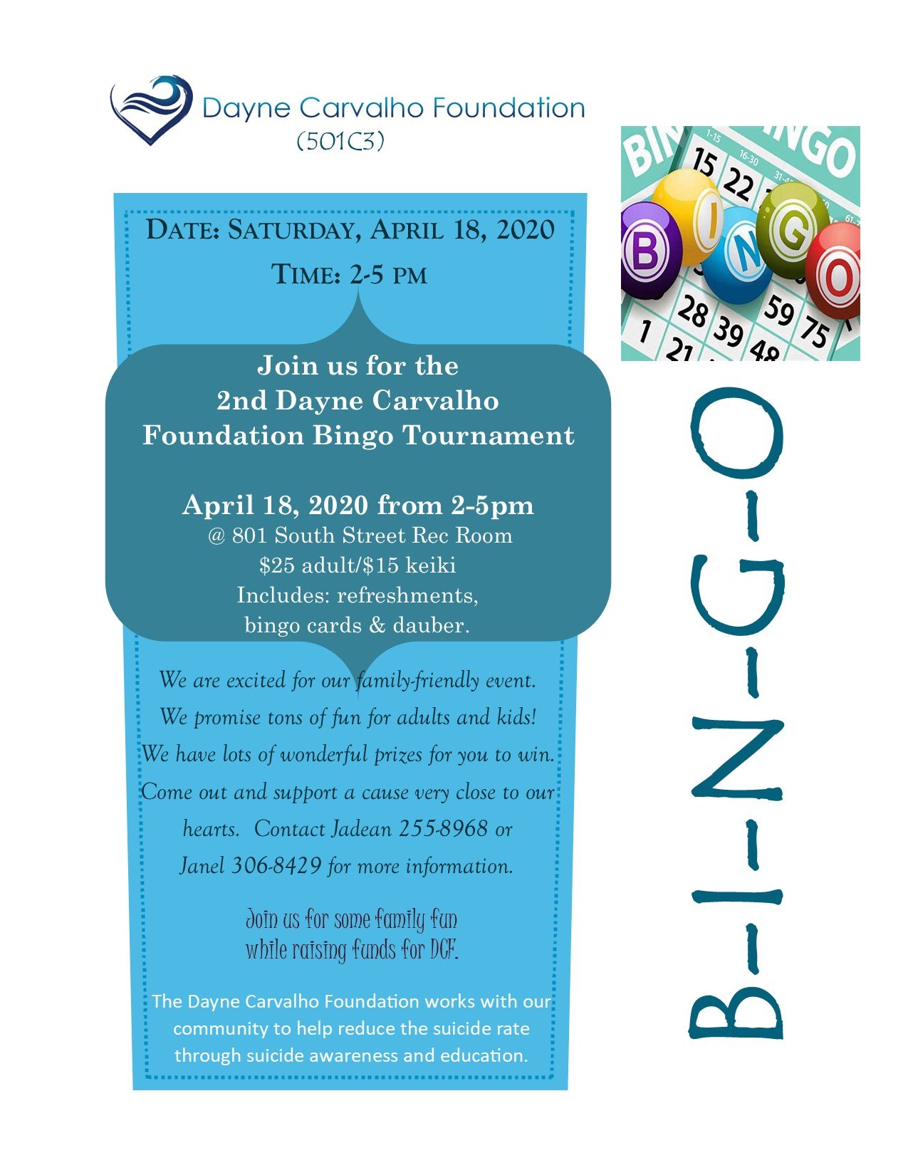 Join us for the 2nd Annual Dayne Carvalho Foundation Bingo Tournament. All information can be found in the flyer below. We look forward to seeing you there.